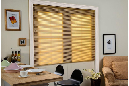 1. Żaluzję drewnianą o szerokości lameli 25 mm z pokrętłem sterującym i szurkami w wybranym kolorze z bocznym prowadzeniem na żyłce