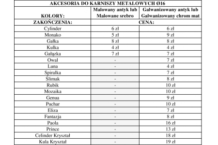 Rodzaj zakończenia oraz kolor (jeżeli jest wybór) podaj w "wiadomości dla sprzedawcy" w kroku nr 2 na etapie składania zamówienia lub prześlij je w wiadomości email po dokonaniu zakupu. Cena z tabeli to ilość jednostek jaką należy dodać do koszyka.